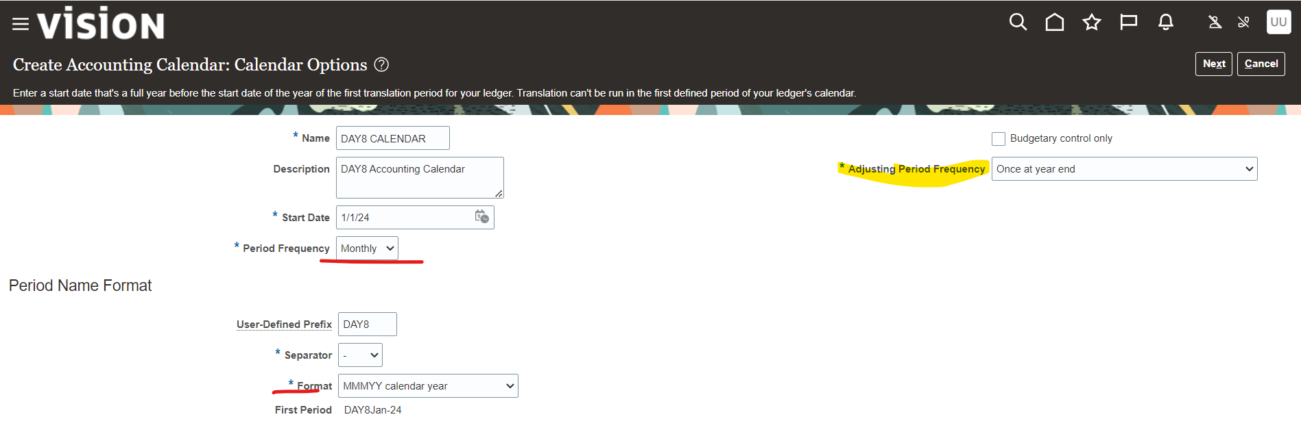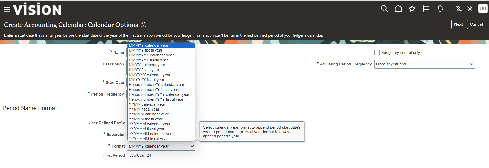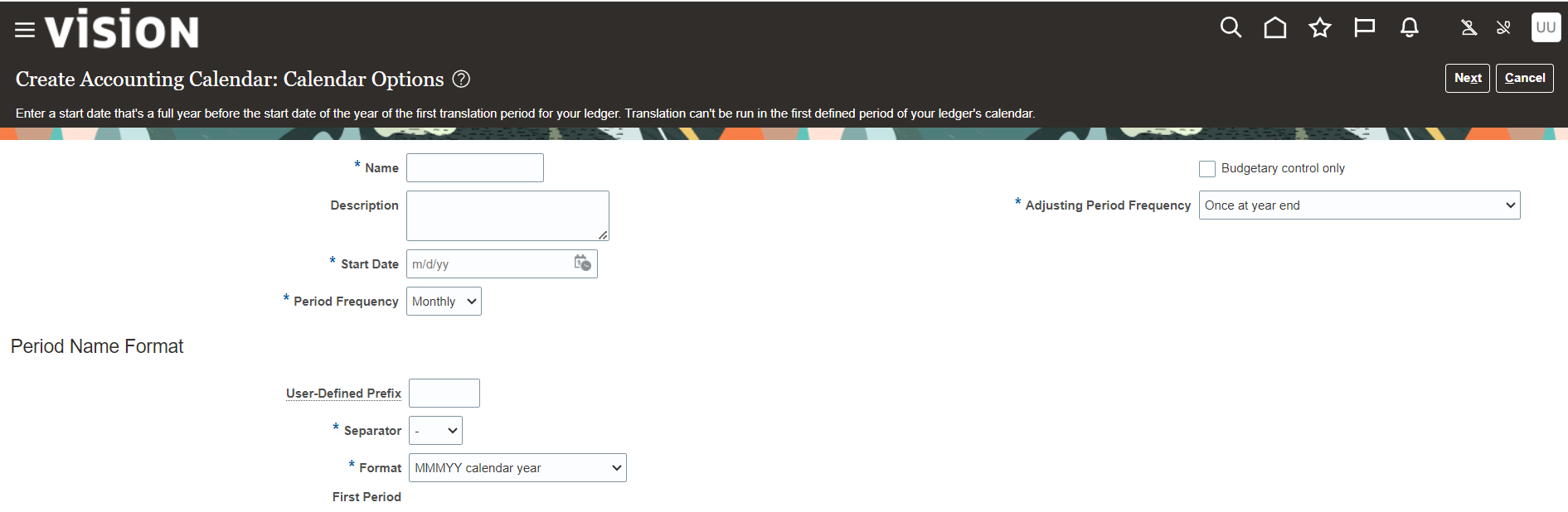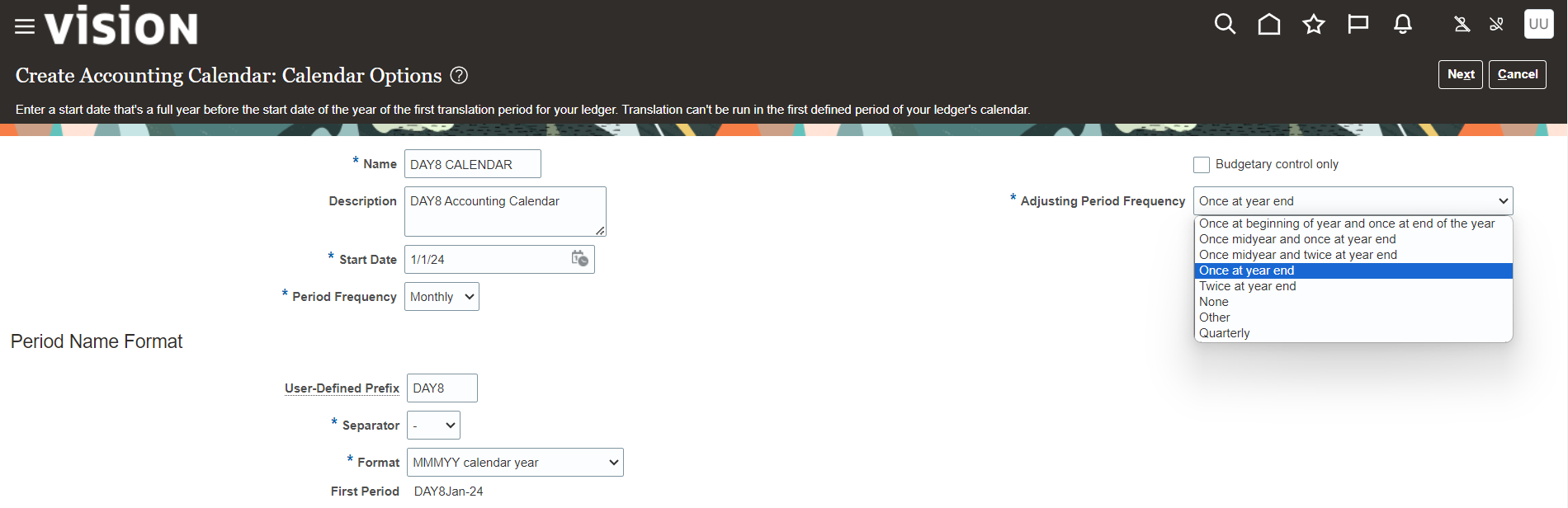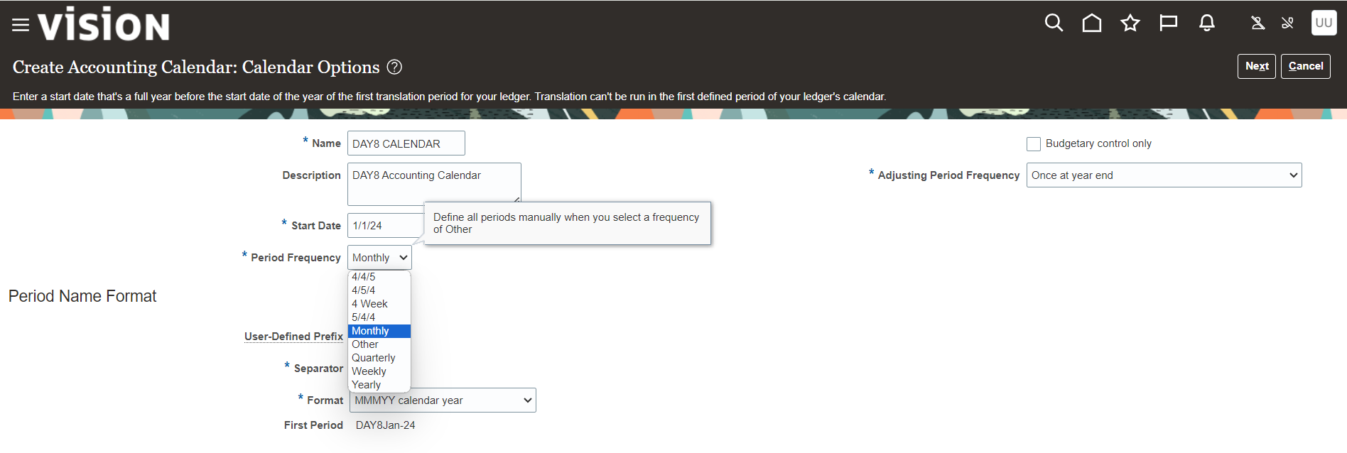- For Period Frequency, select the shortest time period you want to use for reports and activities. Vision Corporation is using Monthly. The period starts on the first of the month and ends on the last day of the month, regardless of the number of days or weeks in each month.