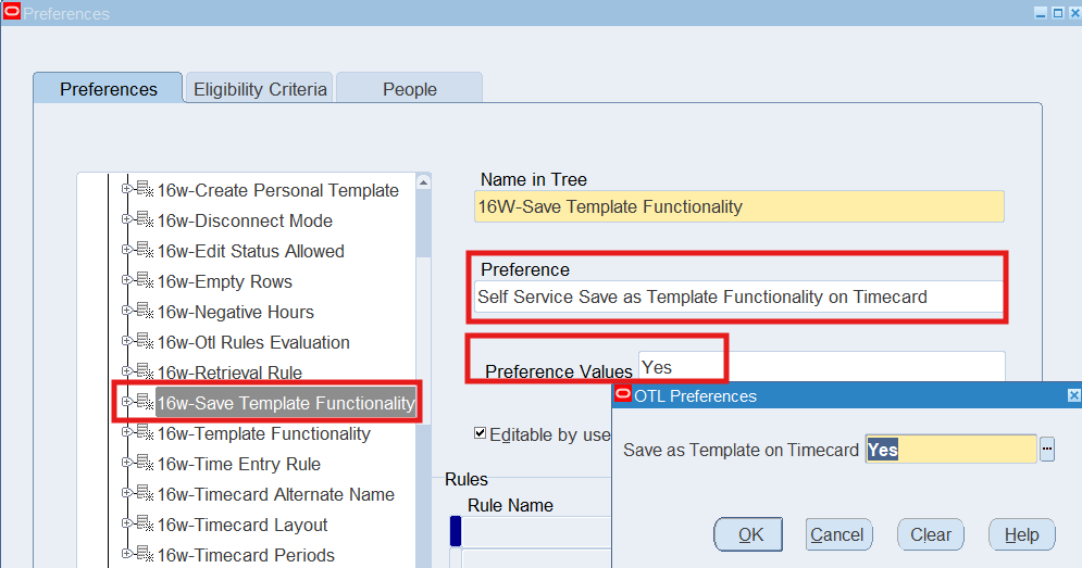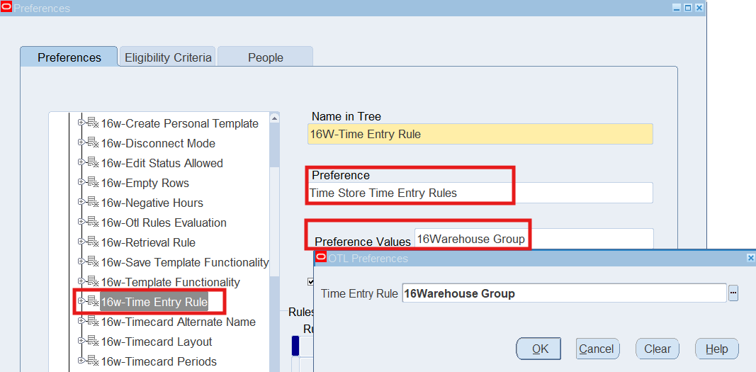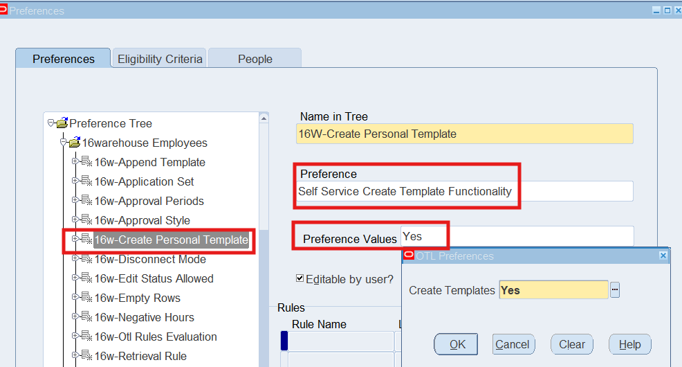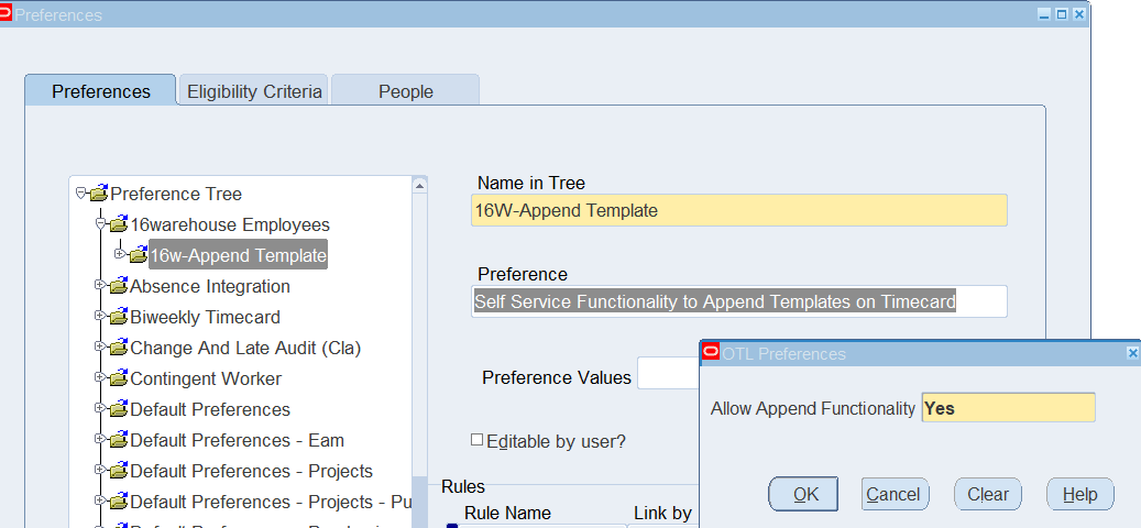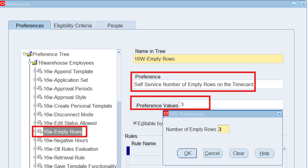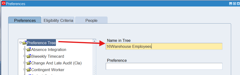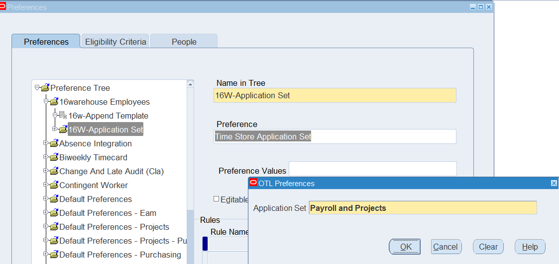 Define various rules for each group of employees within the corporation. You must assign the rules to the groups of employees via Preferences. Oracle Time & Labor includes default preferences with predefined values. However created various rules for 3 groups of employees. Create a new hierarchy containing the preferences for which specify a different value.
