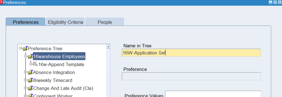 In the Name in Tree field, enter 16W-Applicatoin Set for the preference. At this time, the Preference field is not data-enterable.