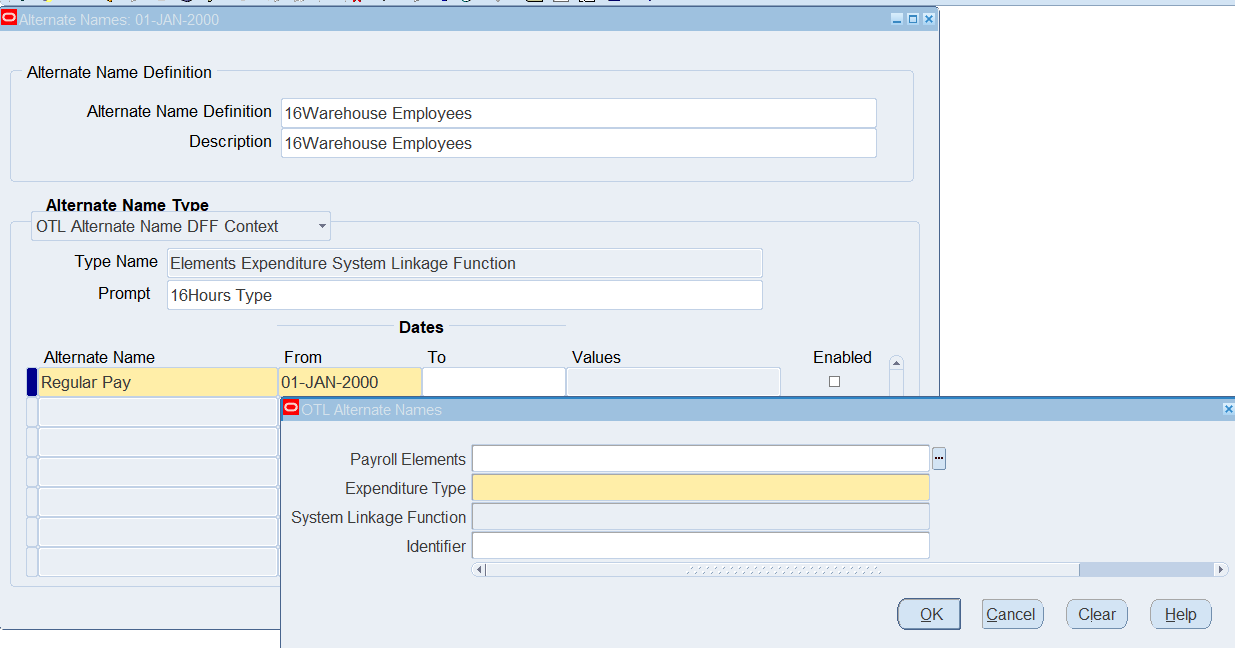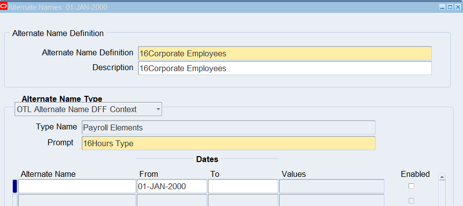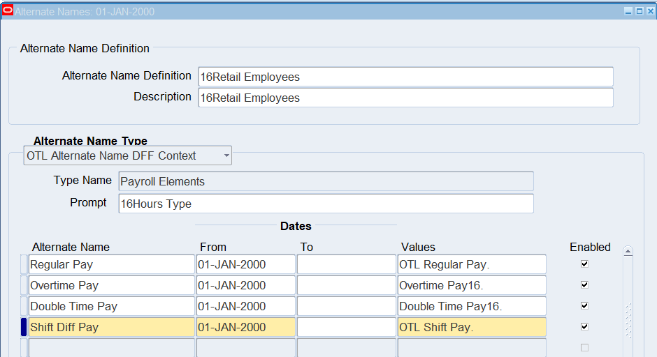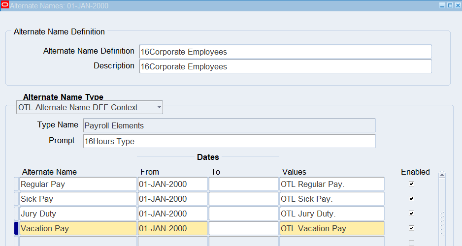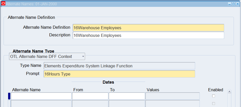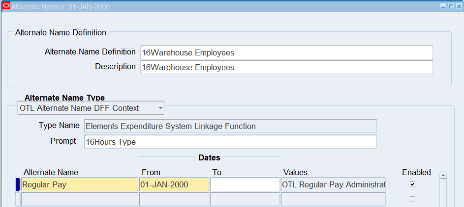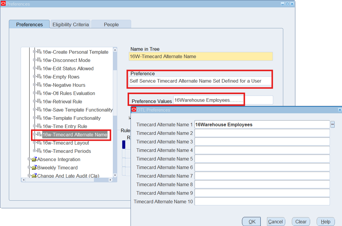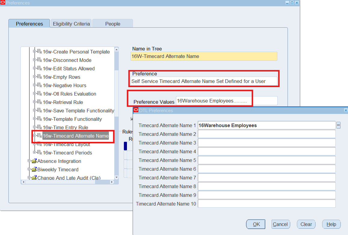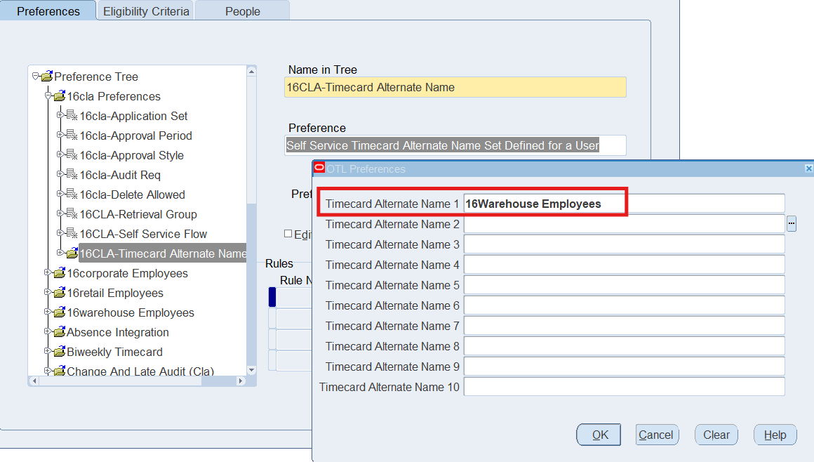16CLA-Timecard Alternate Name Self Service Timecard Alternate Name Set Defined for a User Timecard Alternate Name1 = 16Warehouse Employees