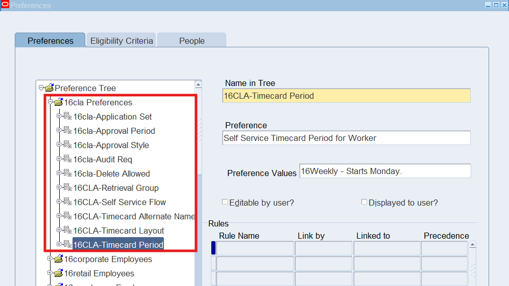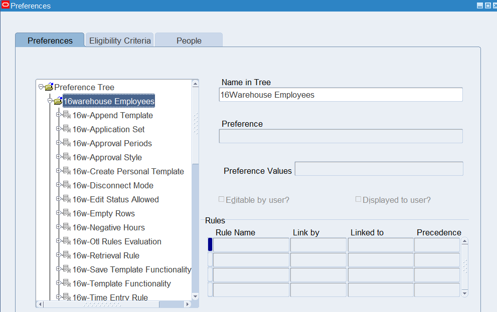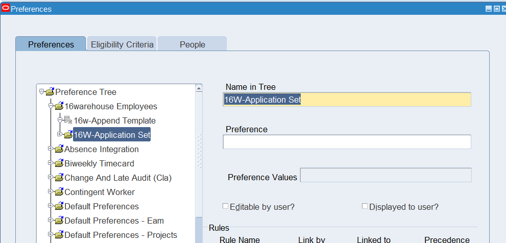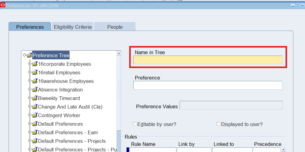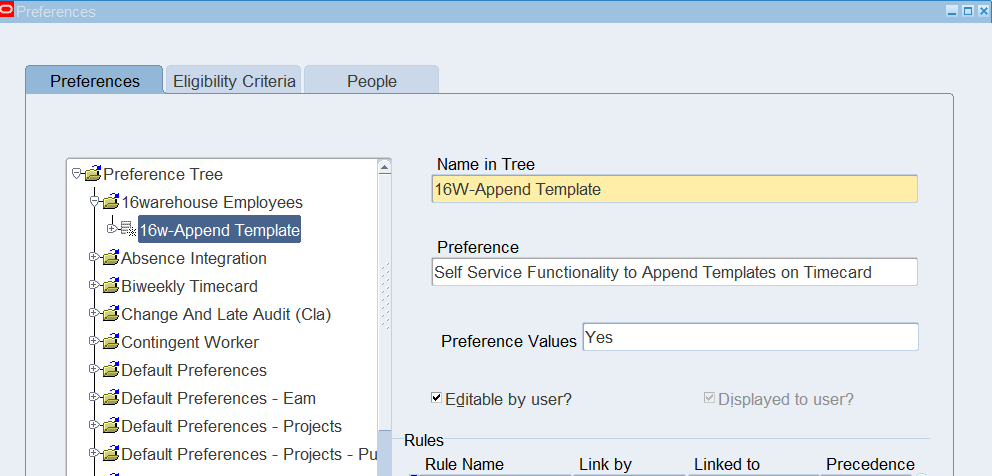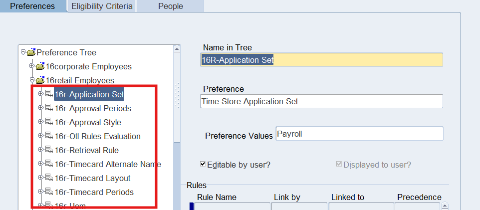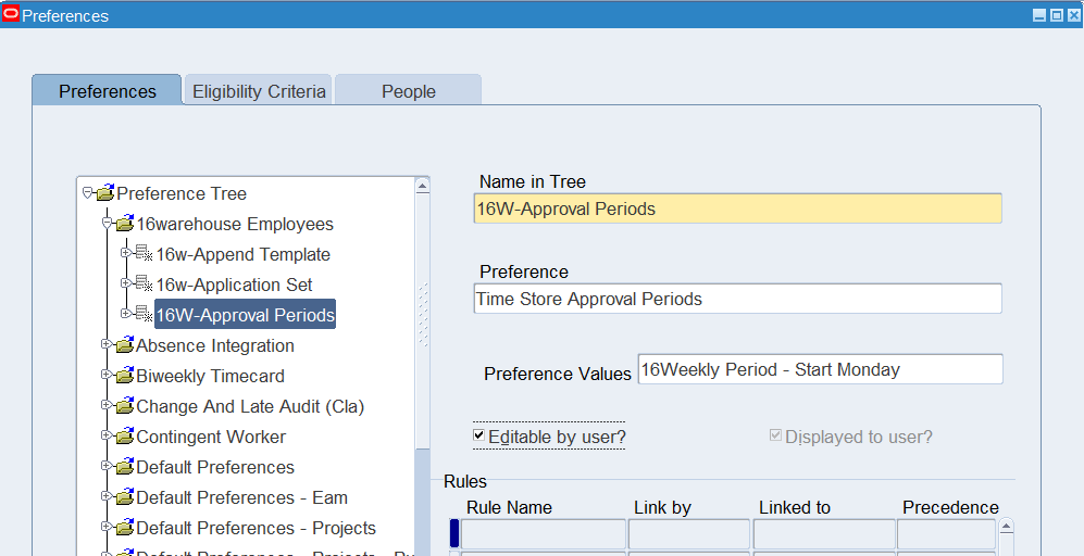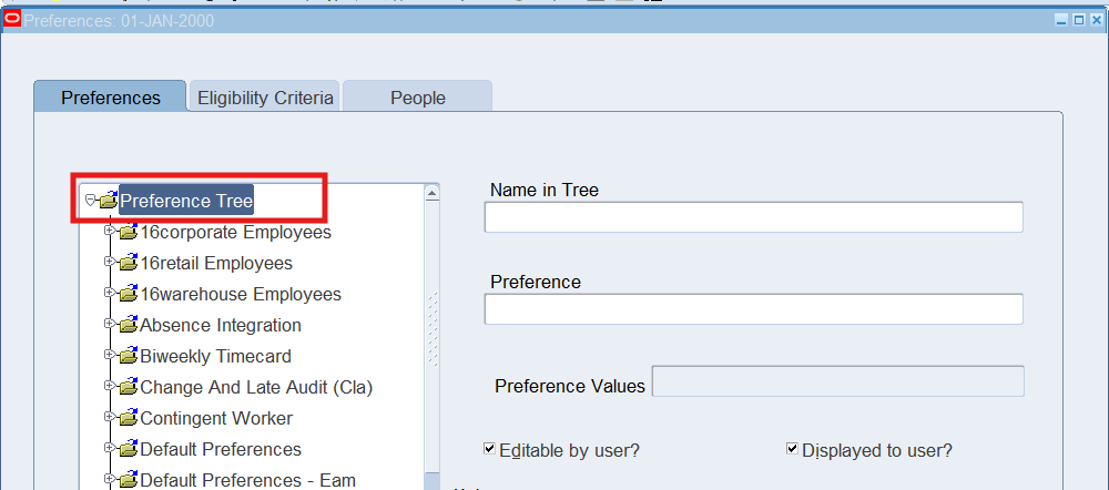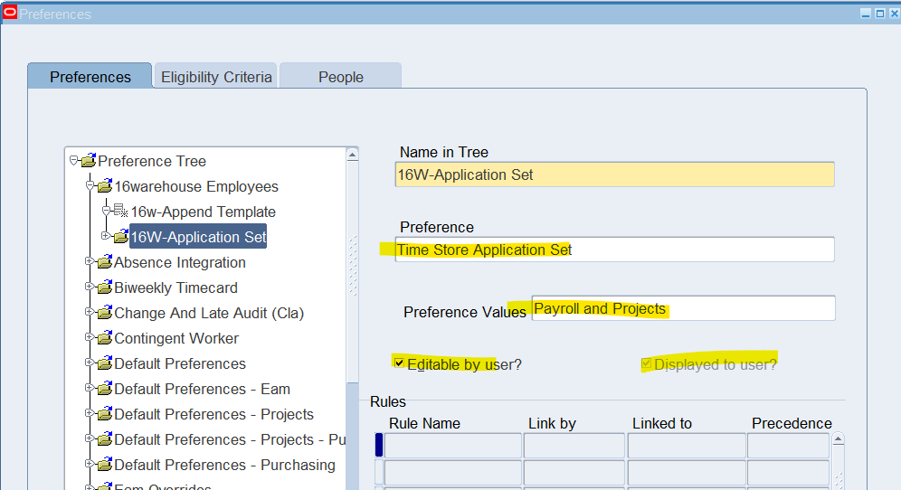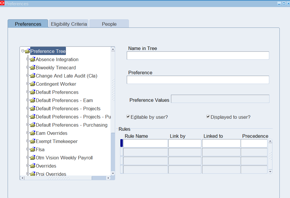 Preferences define many rules about how individuals or groups of workers use the application. Preferences hold rules for the time store and about Self Service timecard. While Oracle Time & Labor deliver predefined preferences you cannot change these rules. However, we can create as many new hierarchies as needed for our business requirements.