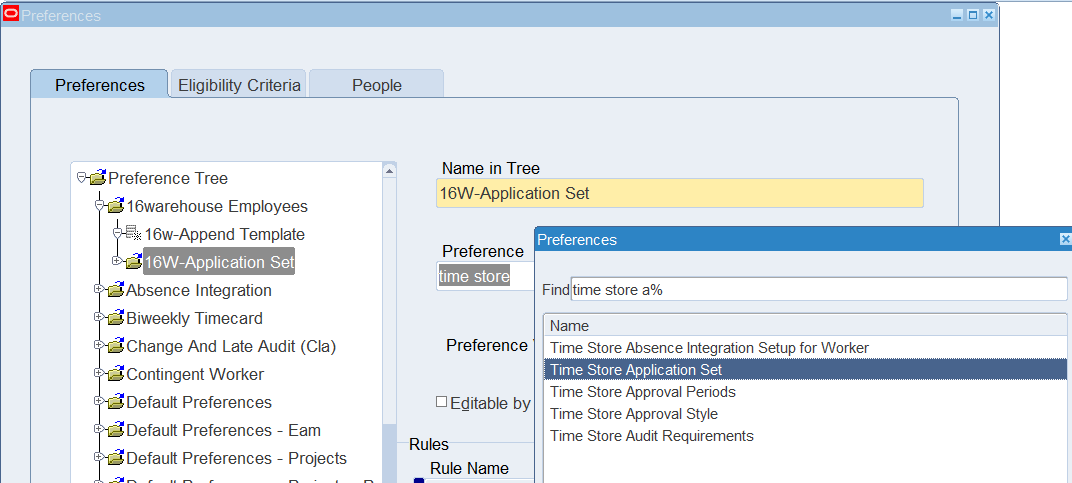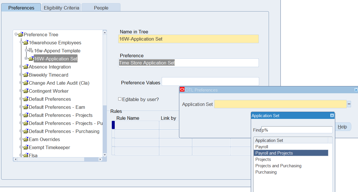 1. Create a new preference hierarchy for Time Entry Rule Groups, and other required preferences in order to successfully enter a timecard using Change and Late Audit rules.