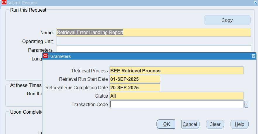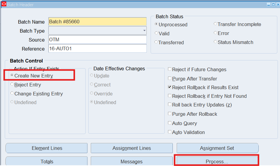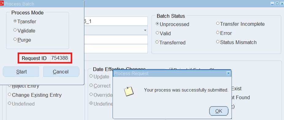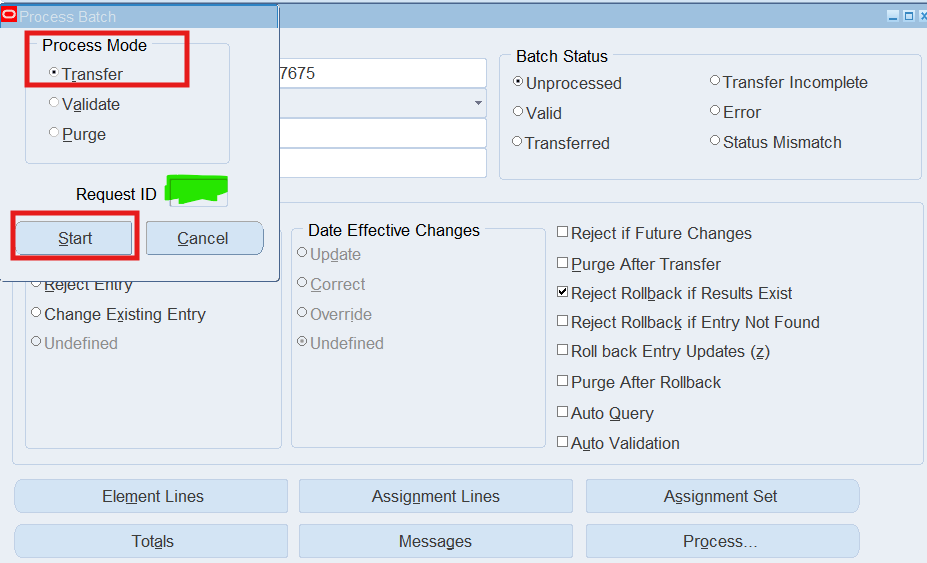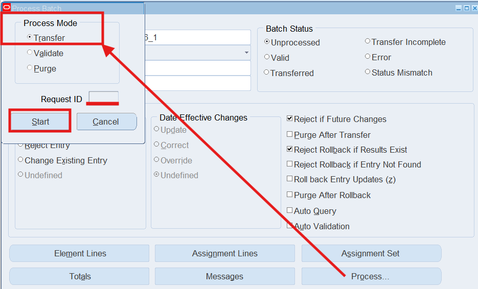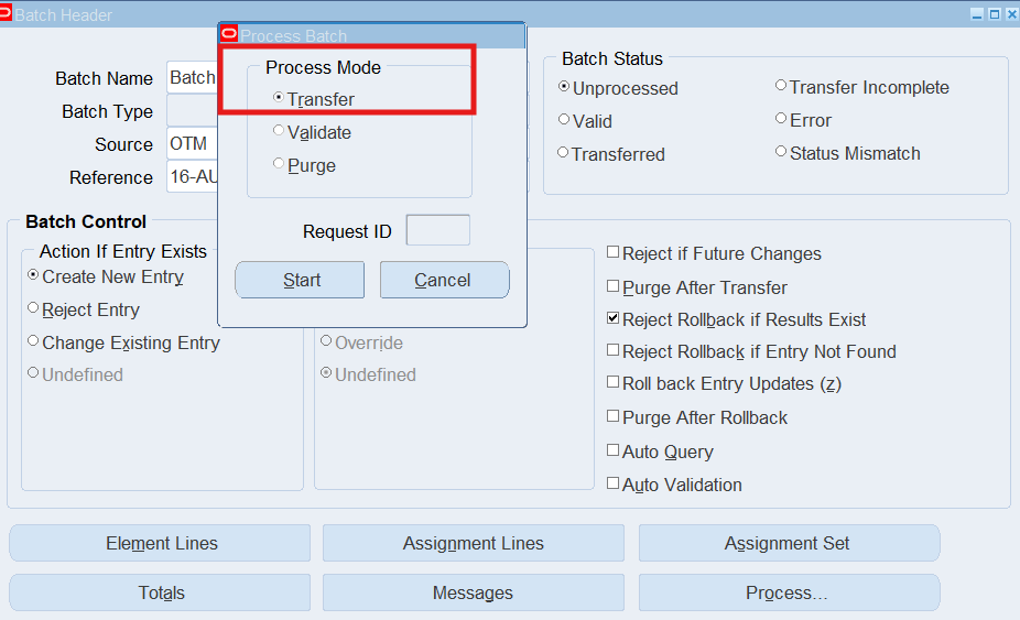 Note: If the Batch Status is “Unprocessed”, choose the Process button, select “Transfer” as the Process Mode, choose the Start Button.