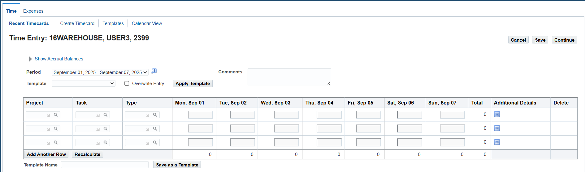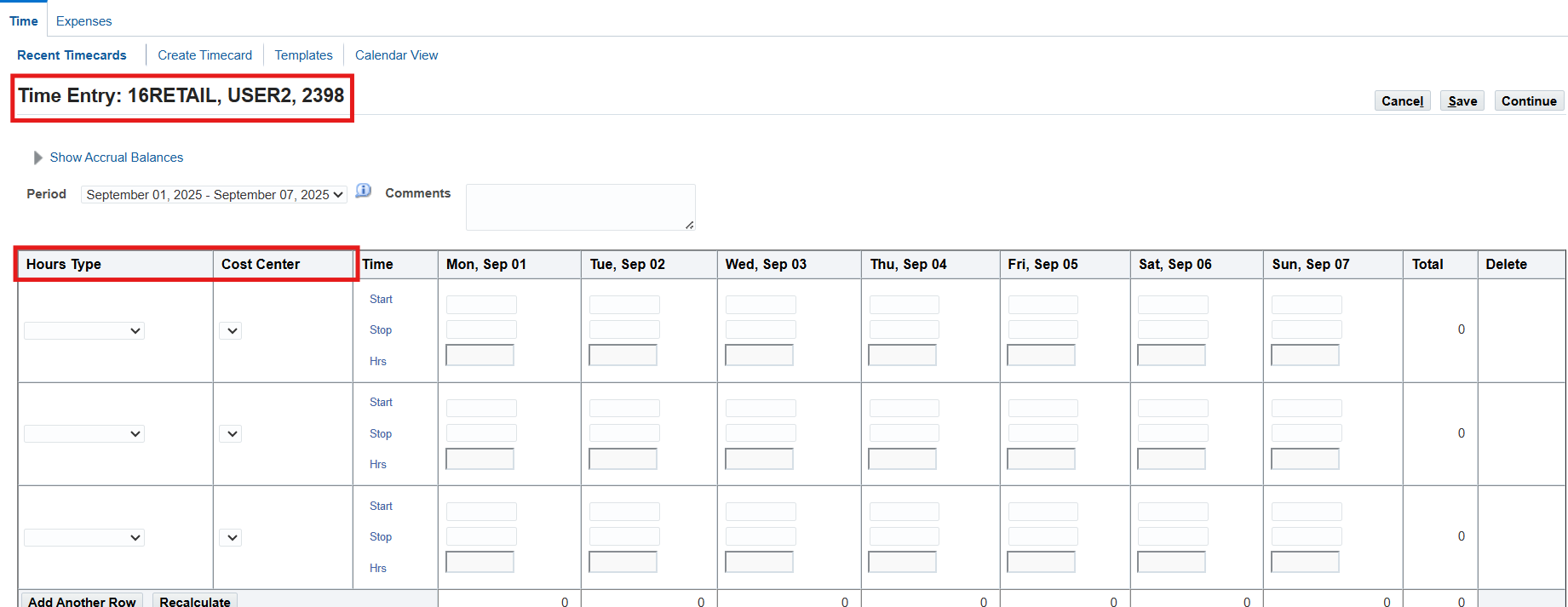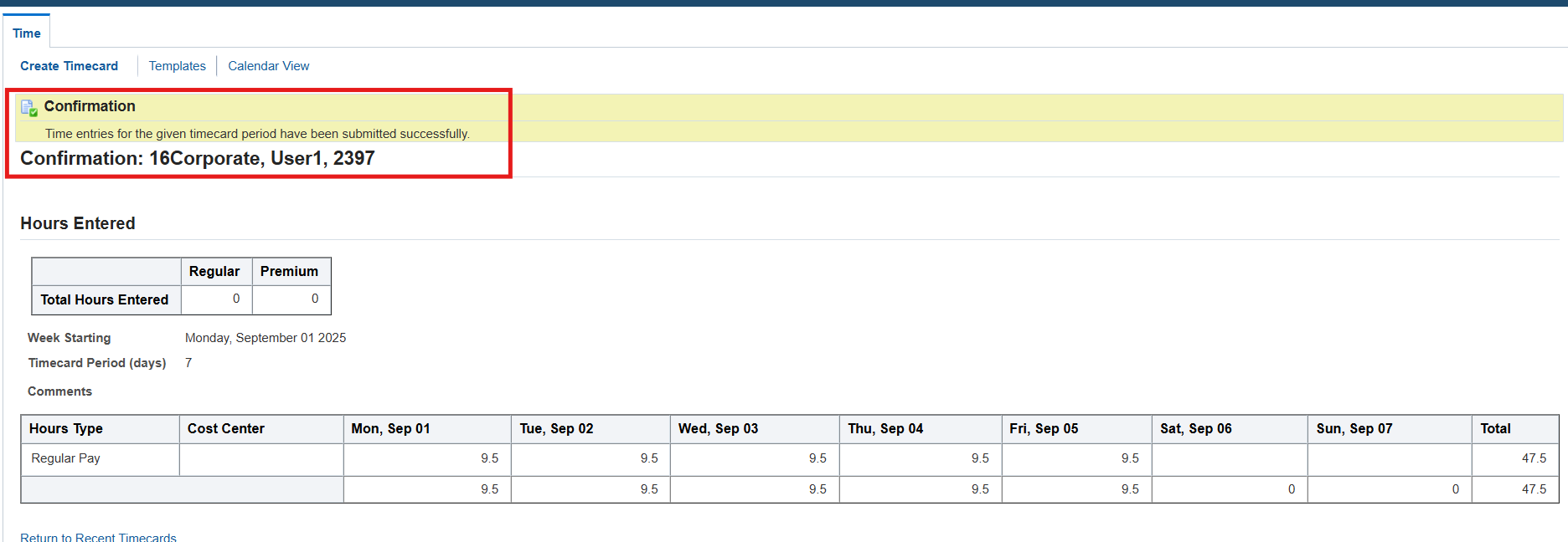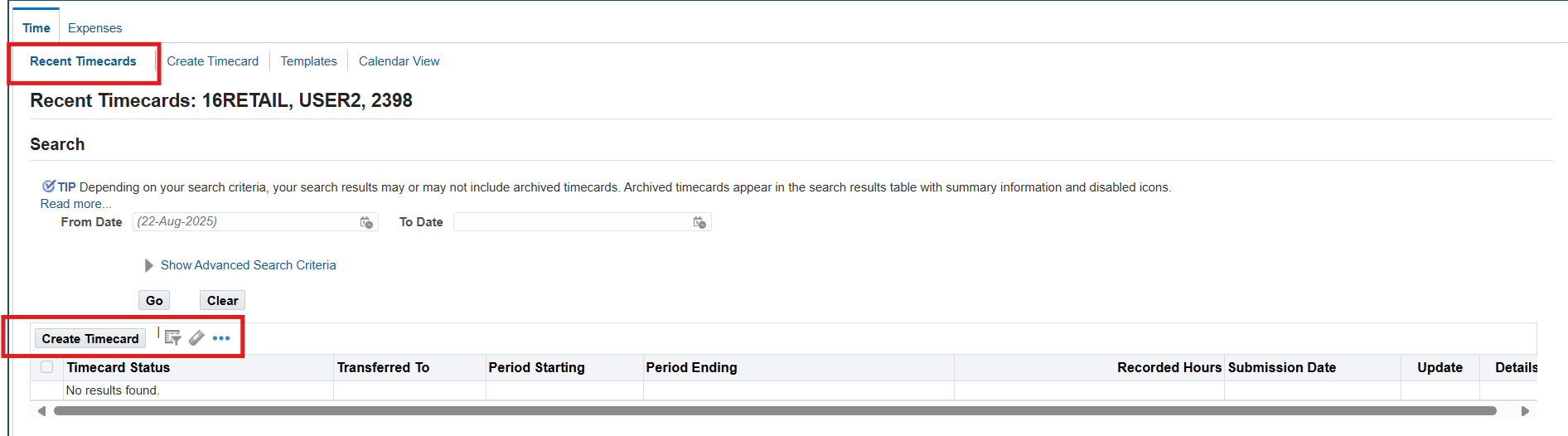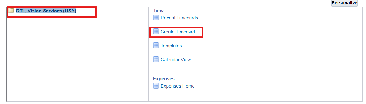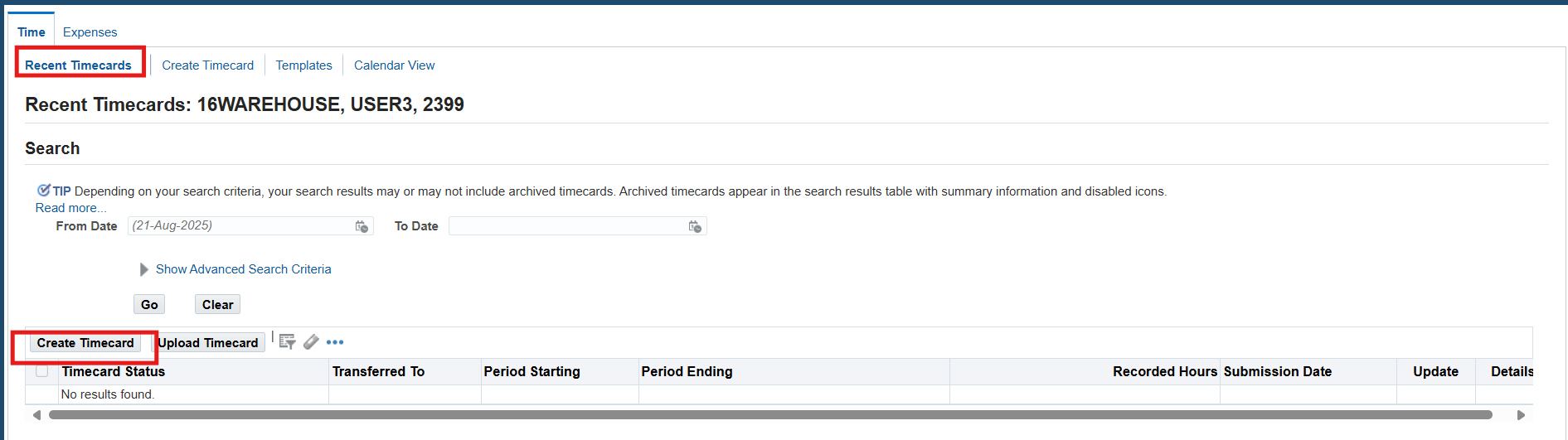 3. On the Recent Timecard page, select Create Timecard button