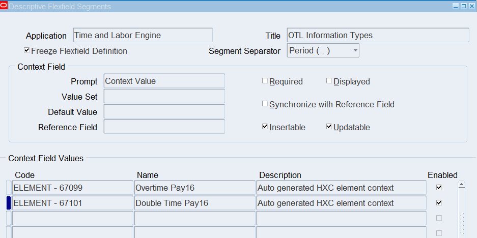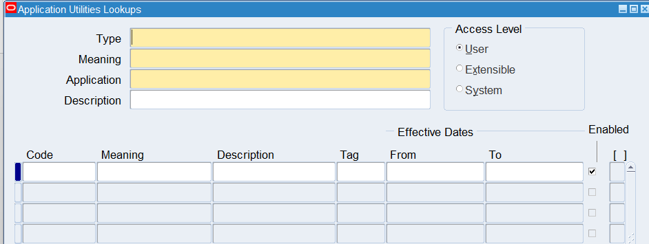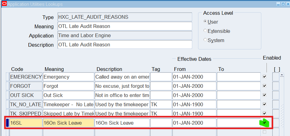 Note: Leave the Enabled check box is selected. If you do not select this check box, the code will not display in the list of values.