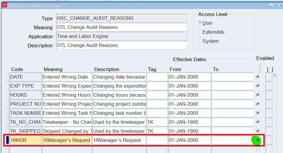 Define a Change Reason of Manager’s Request with a code equal to MGR.
